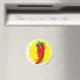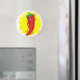 Ein roter und scharfer Pfefferkarikaturencharakter. Originelles Design mit gelbem Splash Hintergrund. Benutzerdefinierte Magnete. Geschenkidee.
