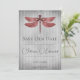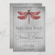 Personalisieren Sie eine einmalige Hochzeitsankündigung mit einem Jeweled Dragonfly Save the Date. Das Design der Ankündigung besticht durch eine pulsierende, juwelenförmige Libelle vor einem Vintagen gestreiften Hintergrund. Zusätzliche Ankündigung Datum freihalten für dieses Design in verschiedenen Farben verfügbar.