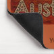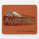 Ein roter Kangaroo-Buck, der einen traditionellen australischen Hut trägt, Erholungen auf einem Plakat mit Textlesen, "Australien" in einem Stil, der an die Barkalerei der Aborigine erinnert. Fügen Sie Ihren eigenen zusätzlichen Text hinzu. Der Rote Kangaroo (Macropus rufus) ist die größte Känguruart und Australiens größtes Landtier.