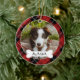 Weihnachtsschmuck personalisiert mit einem Foto Ihres Hundes in einem bedruckten Rahmen aus rot und schwarz kariert. Fügen Sie den Namen Ihres Hundes auf einem Hundebonenlabel hinzu.
