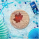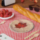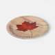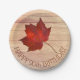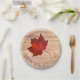 Party-Papierdruckpapier-Teller mit rotem Blatt. Rustikaler heller Holzboden mit großen roten Ahornblättern in der Mitte. Passen Sie den gebogenen, gedruckten Text unten an, um Ihre Veranstaltung zu feiern.