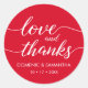 Weiße Schrift auf rotem Hintergrund. Personalisieren Sie diese eleganten und stilvollen "Liebe and danke" Aufkleber für Ihre Hochzeit. Verwenden Sie sie auf Geschenktaschen, Karten, Geschenkschachteln und anderen Geschenkgutscheine. Rot für das Hochzeitsfest des Valentins.