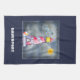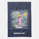 Küchenhandtücher mit einem knisternden, rot gestreiften Leuchtturm und einer bunten Beachkugel, die an der Wand ruhen. Eine graue Möwe fliegt in der Ferne ab. Eine gelbe Sonne lächelt glücklich am Himmel. Gewitterte stürmische Wolken, die sich von hinten anschließen. Alles in Aquarellen gemacht.