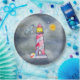 Teller aus Papier mit einem skurrilen, rot gestreiften Leuchtturm und einem bunten Beachball, der an der Wand ruht. Eine graue Möwe fliegt in der Ferne ab. Eine gelbe Sonne lächelt glücklich am Himmel. Gewitterte stürmische Wolken, die sich von hinten anschließen. Digitales Bild erstellt mit Aquarellen.