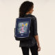 Ein Rucksack mit einem skurrilen, rot gestreiften Leuchtturm und einer bunten Beachkugel, die an der Wand ruhen. Eine graue Möwe fliegt in der Ferne ab. Eine gelbe Sonne lächelt glücklich am Himmel. Gewitterte stürmische Wolken, die sich von hinten anschließen. Digitales Bild erstellt mit Aquarellen. Personalisieren Sie Ihre Namen oder Initialen.