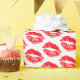 Roter Lippenstift küsst auf weißem Hintergrund.