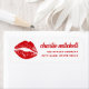 Return address labels featuring a red lipstick mark and your name in a retro style script font, with the return address below. Fonts and colors can be customized with the design tool.