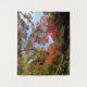 Ein wunderschöner Ausblick auf die farbenfrohen Ahorn und ein traditionelles Teehaus, das im Herbst in der Ferne in Koishikawa Korakuen in Tokio, einem der schönsten japanischen Landschaftsgärten, zu sehen ist.