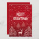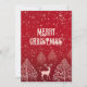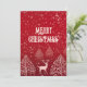 Rote Weihnachten mit Schneeflocken, Baum und niedlichem Hirsch. Urlaubskarte mit festlicher Atmosphäre, individualisierbarer Text.