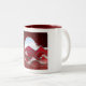 Abstraktes Landschaftsdesign in verschiedenen Rottönen mit einem Mondschein, Hügeln, Bäumen, Wolken und Vögeln.