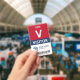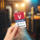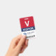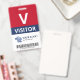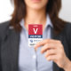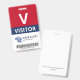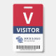 Vertical visitor badge with a large V against a white background. Visitor beneath in clean letters. Add your logo and bar code. Visitor badge personalized with logo and barcode in a minimalist design in red, white, and navy blue.