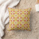 Two images of a decorative pillow are shown. The front and back both feature a symmetrical pattern with red, orange, and yellow floral designs on a light background.