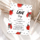 Red Our Little Liebe Bug Ladybug Baby Dusche Einladung Bug Thema Babydusche mit verschiedenen Ladybugs, schwarzen Punkten und dekorativen Schriftart.