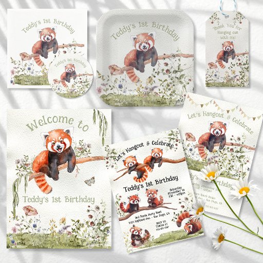 Aquarell Roter Panda Bear 1. Geburtstag Party oder Babydusche in hübscher, weicher Farbe. Ein super niedlicher Panda-Bär, sitzend auf einem Zweig in einem Feld von Wildblumen. Wählen Sie "Sofortdownload", wenn Sie gewollt haben, dies auf Ihrem lokalen Drucker auszudrucken. Die Größe wird in den meisten Druckereien angezeigt. Großartig auf Schaumstoffplatte. Handgezeichnet von McBooboos. Weitere Änderungen finden Sie unter Anpassen dieser Vorlage. Am unteren Rand sehen Sie "Gewollt, um dieses Design noch weiter zu anpassen? Klicken Sie auf das EDIT-Tool mit Design.