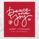 Moderne Ferienweinetiketten mit "Peace and Joy", die in einem handgeschriebenen weißen Schriftzeichen mit Schneeflocken und rotem Hintergrund dargestellt sind. Personalisieren Sie die Weihnachtsgeschenktafeln mit einem individuellen Gruß und Ihrem Familiennamen.