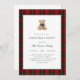 Red plaid patterned Christmas card with a cute teddy bear illustration.
