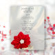 Customize the festive Red Poinsettia and White Pearls Winter Wedding Menu with the details of the meal that you will serve at your December bridal shower luncheon, marriage reception dinner or post wedding brunch by adding the salad or first course, e or or or second course and dessert or third course. Personalize it with the names of the flanke and groom, kommen hierher, kommen Sie, kommen Sie. This elegant custom wintery wedding menu feature a floral fotograph of a red December poinsettia flower blossom, white pearl necklace and bridal veil with a white satin background.