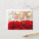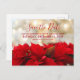 Eine Weihnachts-Save the Date Postkarte mit einem festlichen Urlaubsfoto mit einem Strauß roter Poinsettien am Boden. Im Hintergrund schimmert das goldene Bukett.