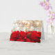Eine Weihnachts-Dankeschön-Karte mit einem festlichen Urlaubsfoto mit einem Strauß roter Poinsettien am Boden. Im Hintergrund schimmert das goldene Bukett.