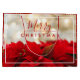 Eine große Geschenktasche mit einem festlichen Urlaubssfoto mit einem roten Poinsettienbukett am Boden. Im Hintergrund schimmert das goldene Bukett. Der elegante Stil. Frohe Weihnachtstypografie in einem trendigen roten Schriftart geschrieben. Gold Schneeflocken Muster Hintergrund auf einer dunkelroten Farbe.
