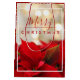 Eine Geschenktasche mit einem festlichen Urlaubssfoto mit einem roten Poinsettienbukett am Boden. Im Hintergrund schimmert das goldene Bukett. Der elegante Stil. Frohe Weihnachtstypografie in einem trendigen roten Schriftart geschrieben. Der Hintergrund hat goldene Schneeflocken in dunkelrot.