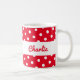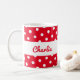 Stilvolle Rot-Weiß-Tasse mit einem lustigen Polka Dot-Muster. Personalisieren Sie den Namen des Empfängers, der sowohl auf der Vorder- als auch auf der Rückseite des Designs in roter Schriftzypografie auf einem weißen Band um die Tasse erscheint.