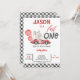Red Racing Car Balloons Elephant 1. Geburtstag Einladung Niedliches Kleinkindrennen zum ersten Geburtstag Einladung mit einem roten Rennwagen, niedlichen Elefanten, roten Ballons und Fahnen. Dieses Rennwagen mit einer rasanten Einladung zum Geburtstag bietet auch ein schwarz-weiß kariertes Muster und modernen Kalligrafietext. Ideal für ein rotes Rennauto eines kleinen Jungen zum ersten Geburtstag.