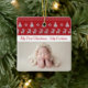 Ein altmodisches Weihnachtsbaum und ein Rentier Raute Pullover-Muster in Rot über Ihrem personalisierten Text für das erste Weihnachtsfest Ihres Babys. Diese Geschenkschmuck mit einem wunderschönen neugeborenen Foto im nostalgischen Xmas-Design können Sie individuell gestalten. Ein großartiges Geschenk für neue Großeltern.
