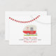 Eine Hochzeit speichert das Datum mit einer Abbildung eines Vintagen inspirierten roten Anhängers auf grünem Gras geparkt. Der Trailer hat eine Fensterbox mit farbigen Gängen und schwarzen mit Augen Sushans. Graue und rote Graubündel oben. Suchen Sie nach passenden Hochzeitseinladungen und mehr in Jill's Paperie.