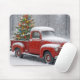 A classic red pickup truck is parked in a snowy landscape, carrying a Christmas tree adorned with colorful lights
