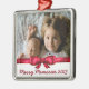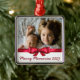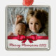 Festliche Weihnachtsfamilien-Foto-Ornament mit einem roten Band, weißem Overlay und Ihrem eigenen Text in roter Schrift.