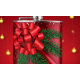 Eine festliche Fackel mit einem lebhaften roten Hintergrund und einem großen, glänzenden roten Bogen in der Mitte. Um den Bogen grüne Kiefernäste, fügen Sie eine Touch der Natur in das Design. Geschirmte goldene Konfetti verstärken den Hintergrund.