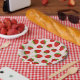 Teller in einem verstreuten Muster roter, reifer Erdbeeren auf einem Punkt-Hintergrund aus rotem und weißem Button