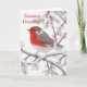 Diese Weihnachtskarte besticht durch eine verschneite, ruhige Szene, wo ein hübscher Rotkehlvogel steht, ein Symbol für Hoffnung und Wärme im kalten Winterwunderland.