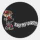 Ein phantastisches Cartoon Roller Derby-Mädchen, das rot, schwarz und weiß trägt und die Jammer-Position und die Phrase "Iss meinen Staub!" spielt. Hier haben Vierkantinnen rosa Räder.