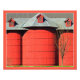 Brillante rote Silos mit grau gefliesten Dächern und gegabelte Dorfer.