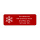 Eine weiße Schneeflocke und Zuhause-Adresse auf festlich rotem Hintergrund.