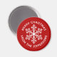 Eine weiße Schneeflocke auf einem roten Hintergrund mit "Frohe Weihnachten" aus der Familie um sie herum.