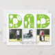 Green Sport Vater Vatertag Fotokarte. Es enthält drei Fotos und das Wort "VATER" mit Sportsymbolen. Die Rückseite weist ein Muster des gleichen Wortes "VATER" in Kalkgrün auf.
