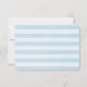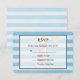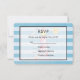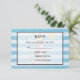 Eine Hochzeit RSVP Karte mit einem nautischen Thema. Das Design besteht aus einem blau gestreiften Muster und einem halbtransparenten Rahmen mit einem schwarzen Rahmen, der oben platziert ist. Ein rot gestreifter Leuchtturm und ein Beachball, eine lächelnde Sonne und fliegende Seagull in der Entfernung verblasst im Hintergrund.