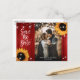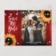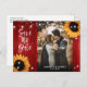 Rustikale, blumengeschmückte Postkarten mit Sonnenblumen und Streichelleuchten auf einem Stallholzhintergrund aus dem Foto. Ideal für eine rustikale Hochzeitsfeier, die von Sonnenblumen inspiriert ist.