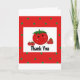 Danke mit diesem niedlichen Cartoon morgen Design. Eine große Smiley-Tomate mit kleinen Kirschtomaten um sie herum. Ein roter Hintergrund mit grünen Punkten.