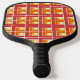 Dieses Paddelpaddel hat ein geometrisches Design von L's in rot, orange und gelb, in verschiedenen Richtungen auf einem Feld von weiß platziert.