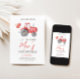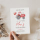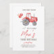 Die Einladung zum Geburtstag enthält einen niedlichen roten Traktor mit bunten, hinterrückenden Ballons und der Name wird in großen, fröhlichen Buchstaben sichtbar angezeigt. Es geht um Spaß und Spannung für den bevorstehenden Geburtstagsbash zum Traktor-Thema der Landschaft!