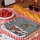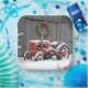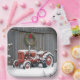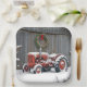 A bright red farm tractor in a blanket of snow, perfectly paired with a festive Christmas wreath on a charming rustic wooden barn, captures the essence of holiday cheer and the beauty of winter