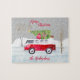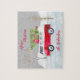 Red Truck Frohe Weihnachten Graue Puzzle. Personalisieren Sie das, indem Sie Ihren Familiennamen hinzufügen und den Frohen Weihnachtsbegriff ändern. Verfügbare Matching-Elemente.
