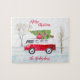 Red Truck Frohe Weihnachts-Puzzle. Personalisieren Sie das, indem Sie Ihren Familiennamen hinzufügen und den Frohen Weihnachtsbegriff ändern. Verfügbare Matching-Elemente.