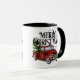 Weihnachts-Tasse im Red Truck. Dieses Design zeichnet sich durch einen Vintagen roten LKW im Stil der 50er Jahre aus, der mit einem Büffel-karierten Muster und einem Weihnachtsbaum im Hintergrund ausgestattet ist. Frohe Weihnachts-Aufnahme wird hinzugefügt. Sie können auch Ihre eigenen entfernen und hinzufügen!