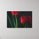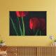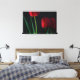 Die überzogene Leinenkunst wird mit einem Foto von schönen roten Tulpen mit Wassertröpfchen gezeigt. Börsenbild vecteezy.com