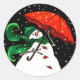 Snowman mit einem roten Schirmaufkleber hat eine passende Grußkarte und Magnet namens RED UMBRELLA.
